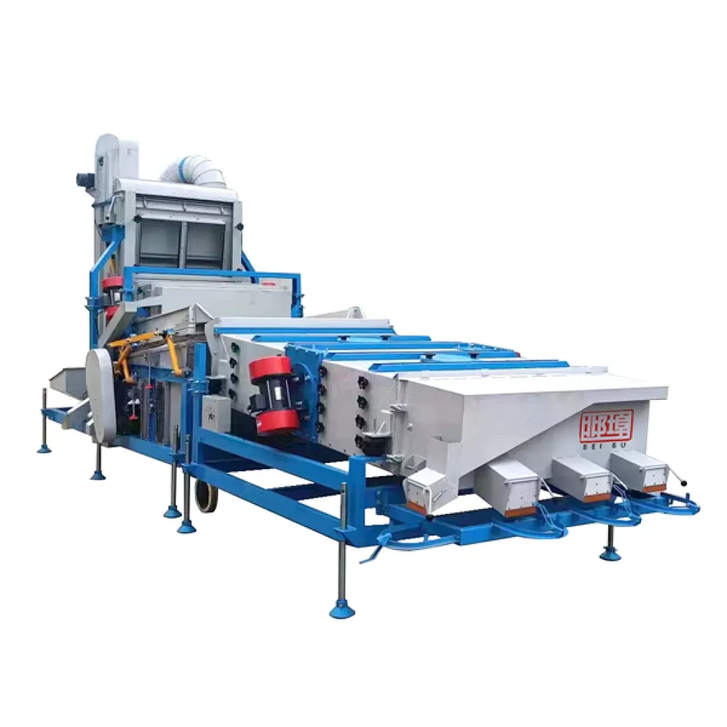4.Finally the grains /seeds will go to the vibration grader . The vibration grader have 4 layer sieves . which can remove the big and small impurities again or separate the grains/seeds to different sizes .