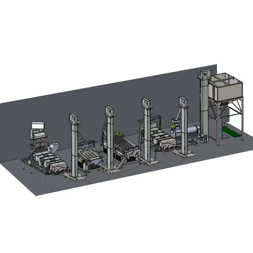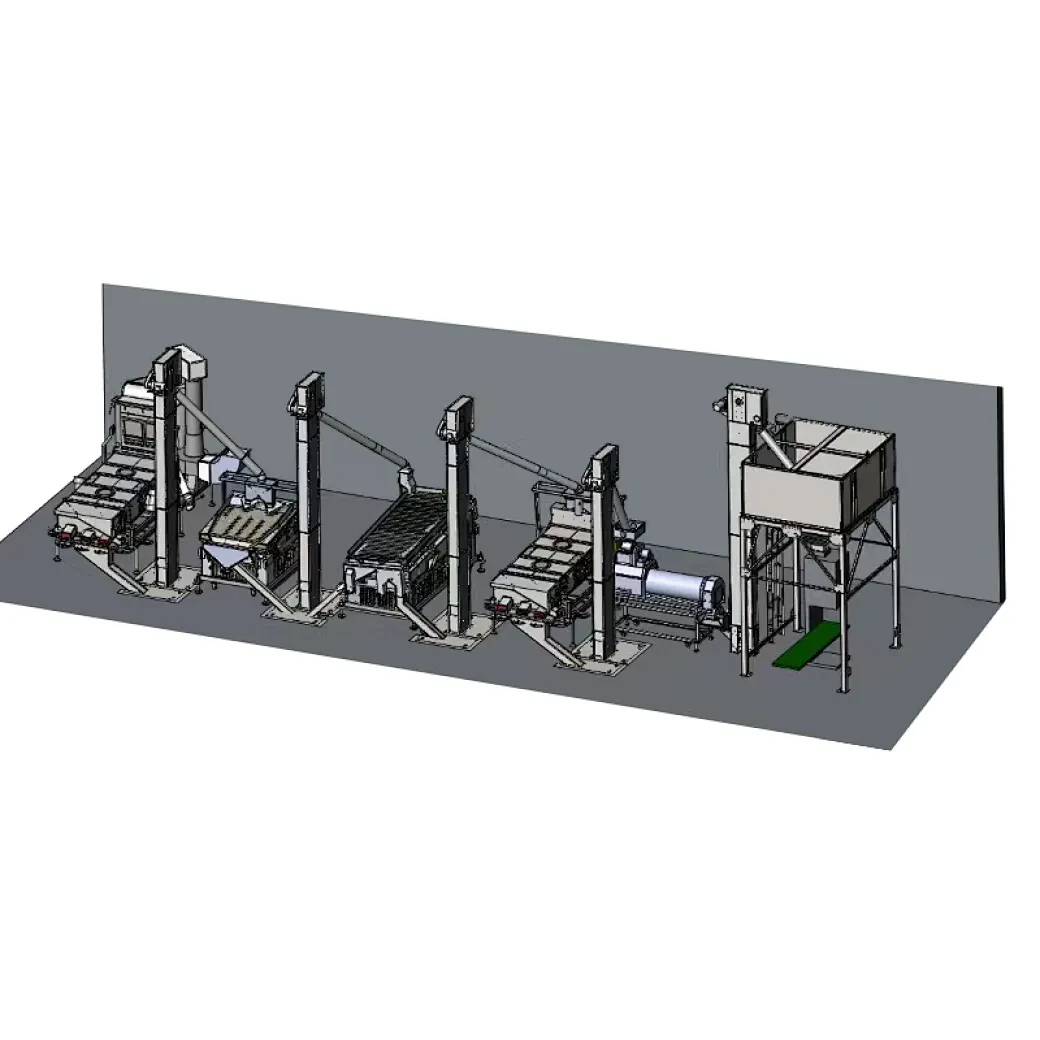 The processing line include the machines as below.5XFS-7.5C air screen cleaner , 5QSC-5 De-stoner,5XZ-5 gravity separator,5XFJ-7.5C Vibration grader , 5BY-5 Seed coating machine ,DCS-50A Packing machine ; DTY-10M elevator loading the seeds to the processing machine.